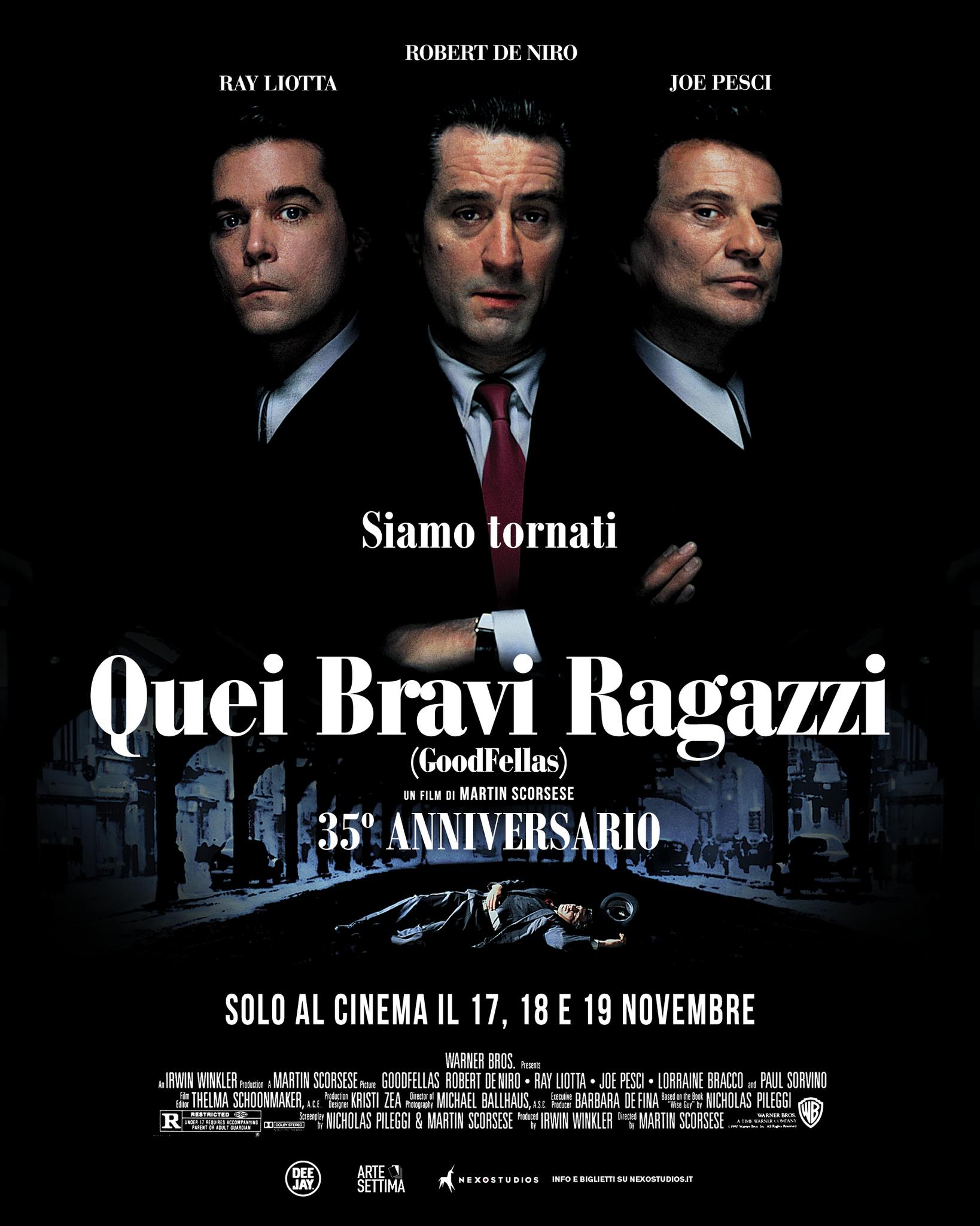 Quei bravi ragazzi, il capolavoro che ha ridefinito per sempre il genere gangster, arriverà sul grande schermo in occasione del suo 35° anniversario come evento speciale distribuito da Nexo Studios. Un film leggendario, Leone d’Argento alla Mostra di Venezia e candidato a sei Premi Oscar, che ha saputo trasformare la vicenda dell’italo-irlandese Henry Hill in un ritratto indimenticabile dell’ascesa e della caduta di un’intera generazione di fuorilegge.